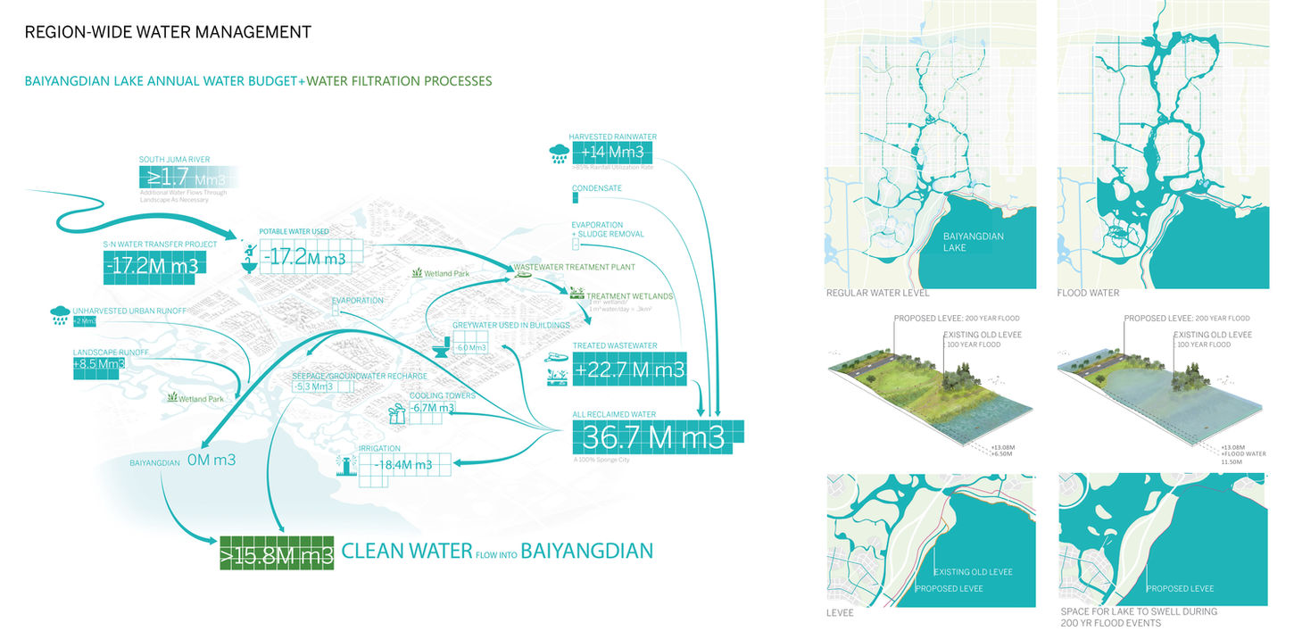 Eastern China is home to a number of vast shallow lakes; Baiyangdian, the site of the new city of Xiong-an is one of them. A regional watershed with nine rivers feeds the lake which despite its size reaches a depth of only 3 meters at the center. The lake has always been fragile and is highly susceptible to agricultural pollution from surrounding farms as well as cycles of flood and drought now intensified by climate change. Normally the outputs of the proposed Xiong-an new city of a million people would only make matters dramatically worse; but this project does the opposite. Through a regional effort the inputs from the watershed have been cleaned up and a complex series of planted levees of varying scales and locks regulates water levels. The runoff of the new city is extensively managed and recycled within its own systems before depositing only clean, fresh water to the lake. This new hydrologic stability now allows the lake to begin to clean and consolidate its waters and sediment once more through the lush native reeds and lotus. This renews its importance as a major stop on the Asian Flyway and lake and surrounding forests are home to tremendous and highly diverse species of birds as well as aquatic mammals and fish – the lake is again bursting with life.